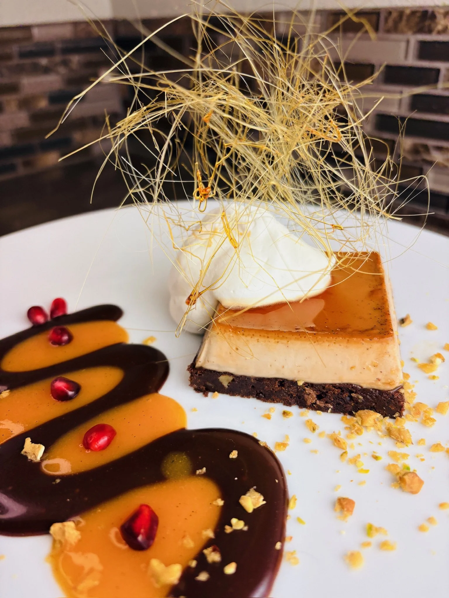 Chai Spiced Flan, Dark Chocolate - Walnut Cake, Tangerine Reduction, Dark Chocolate - Caramel, Whipped Sour Cream