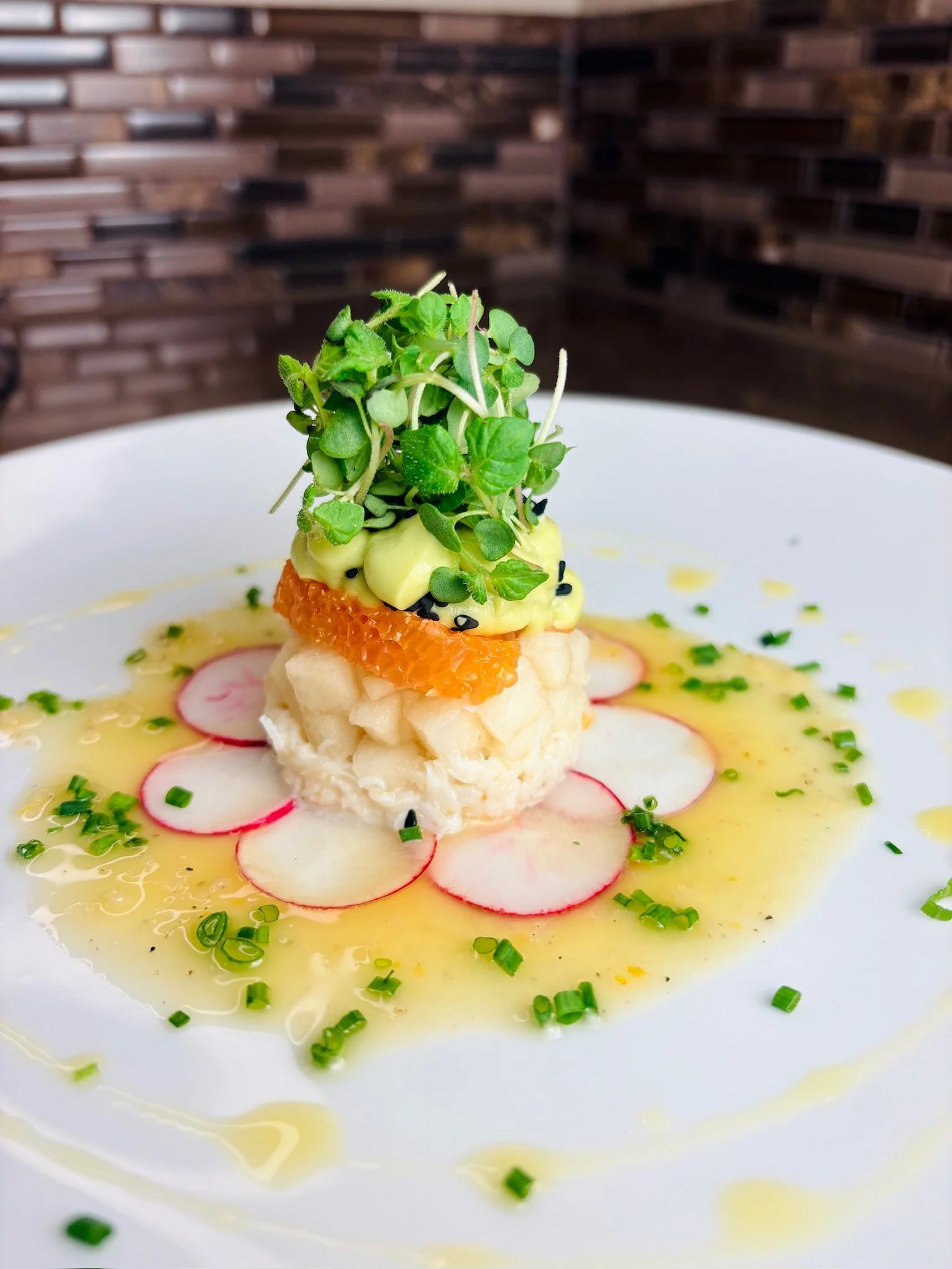 Dungeness Crab, Radish, Asian Pear, Cara Cara, Avocado Cream, Meyer Lemon Vinaigrette, Warm Butter Biscuit