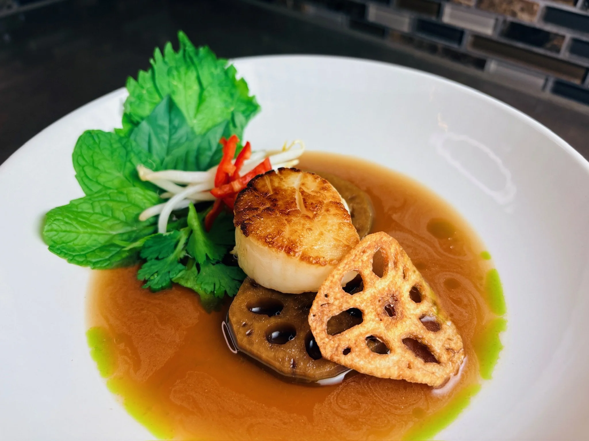 Fermented Black Garlic Consommé, Diver Scallop, Lotus Root, Chive Oil, Lotus Root