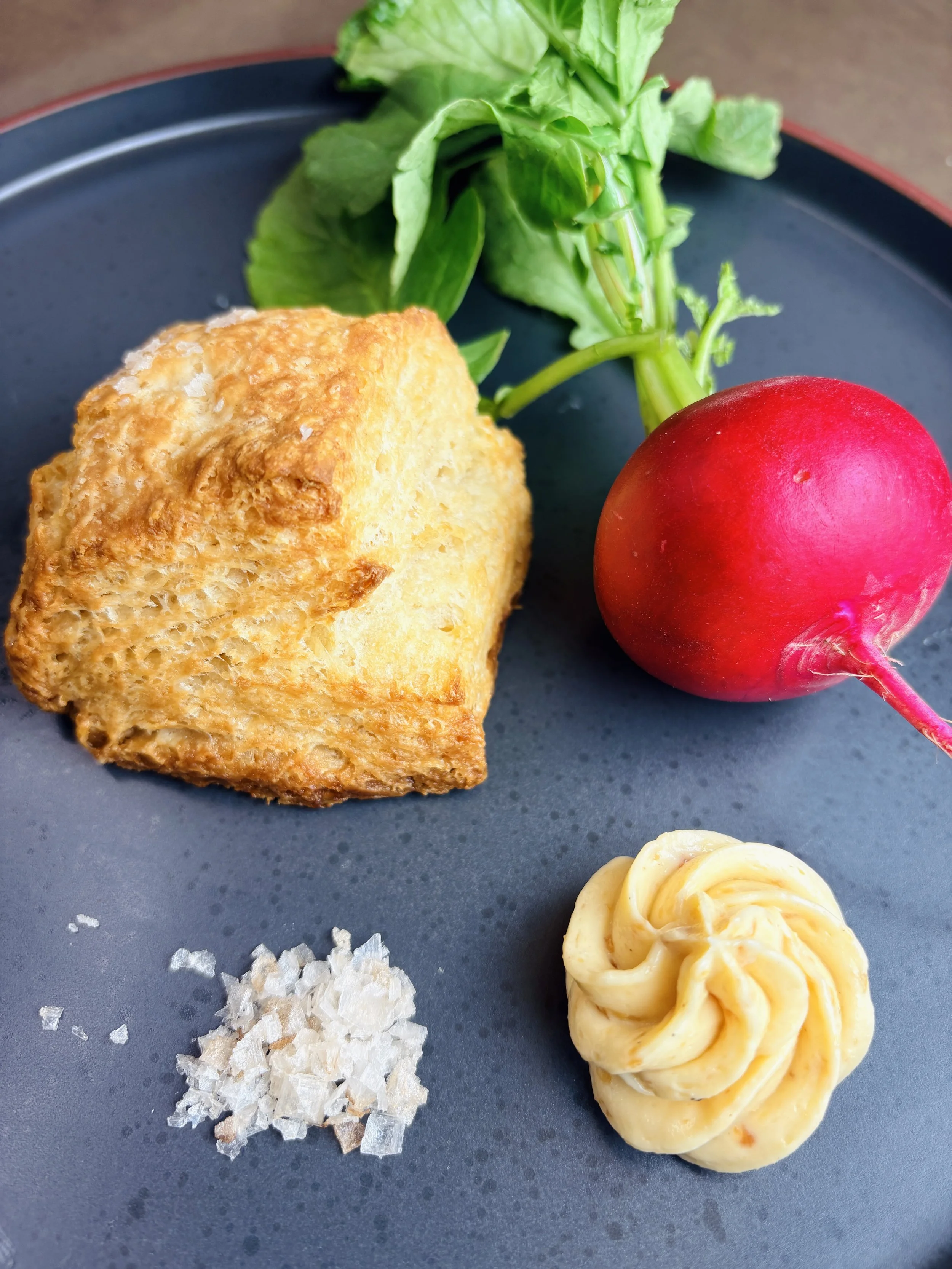 Crispy Chicken Skin - Miso Butter, Spring Radish, Smoked Maldon Salt, Warm Butter Biscuit