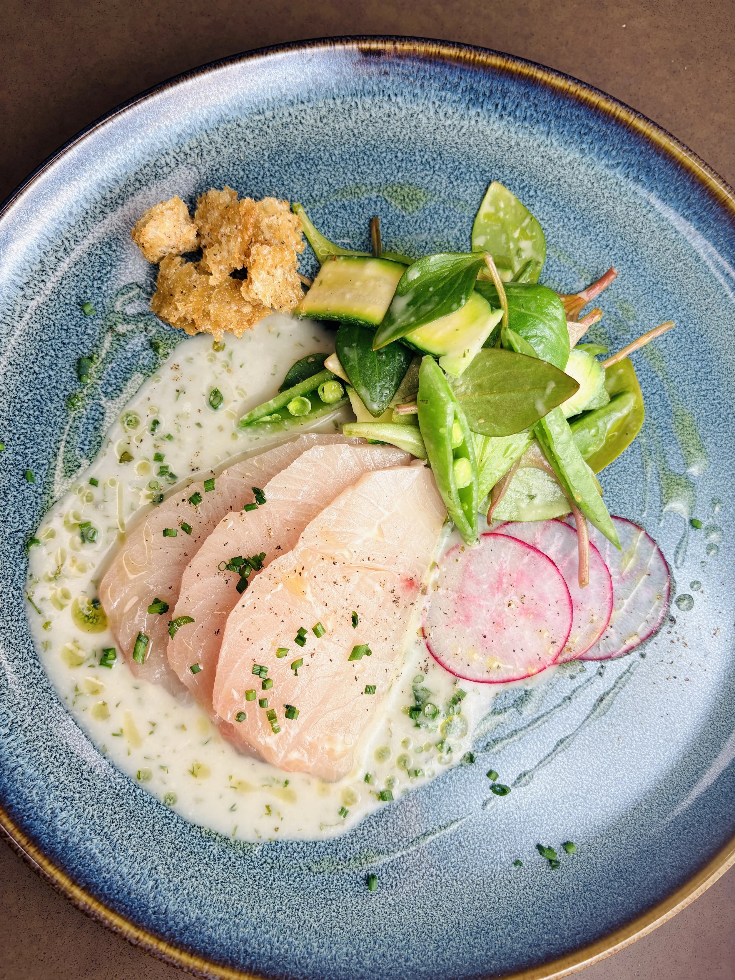 Hamachi Crudo, Miner's Lettuce, Radish, Spring Peas, Baby Zucchini, Garlic Croutons, Tarragon - Yuzu Dressing