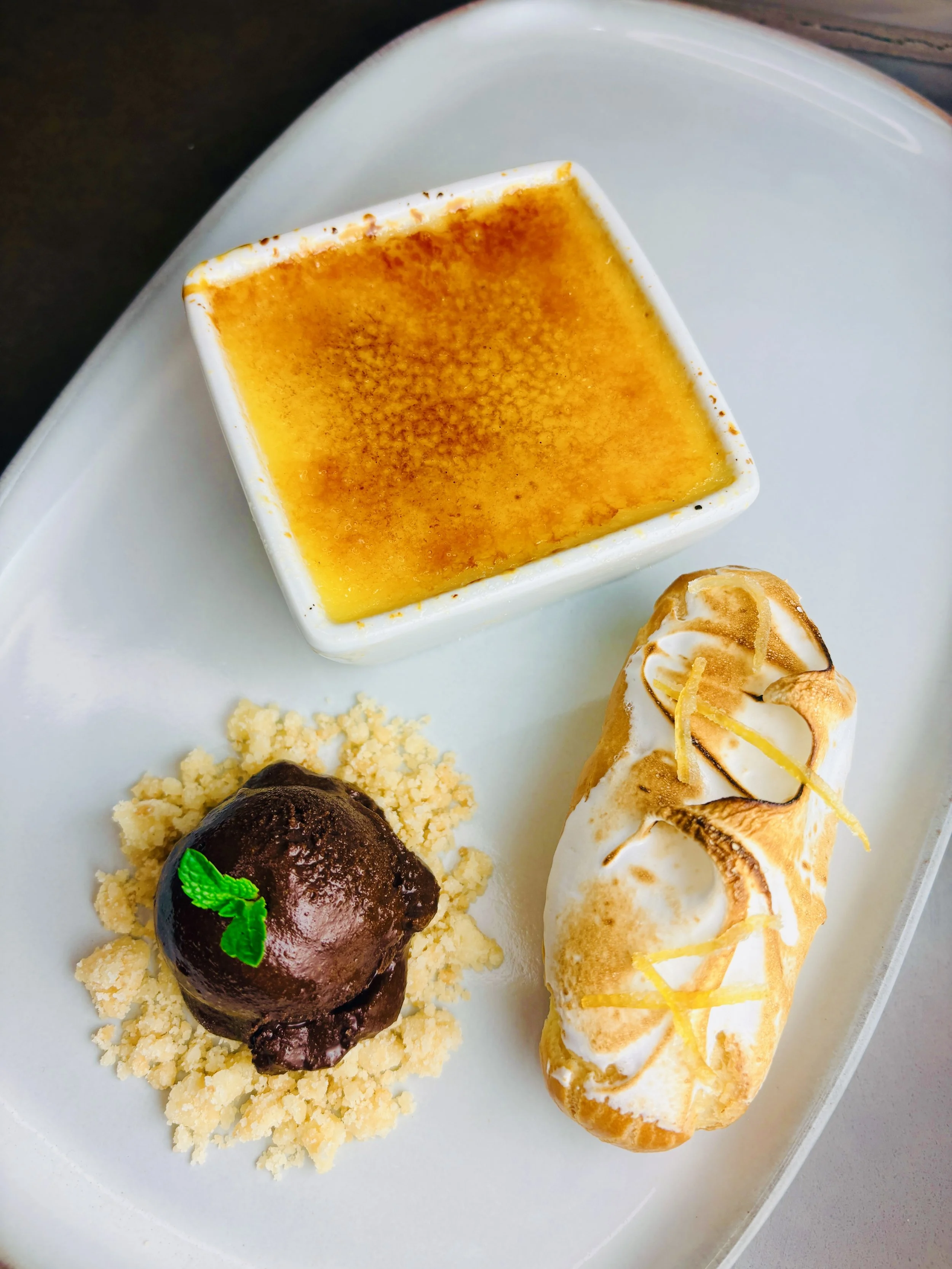 Sweet Trio: Meyer Lemon Curd Eclair, Toasted Meringue, Grand Marnier Creme Brulee, Chocolate - Mint Sorbet