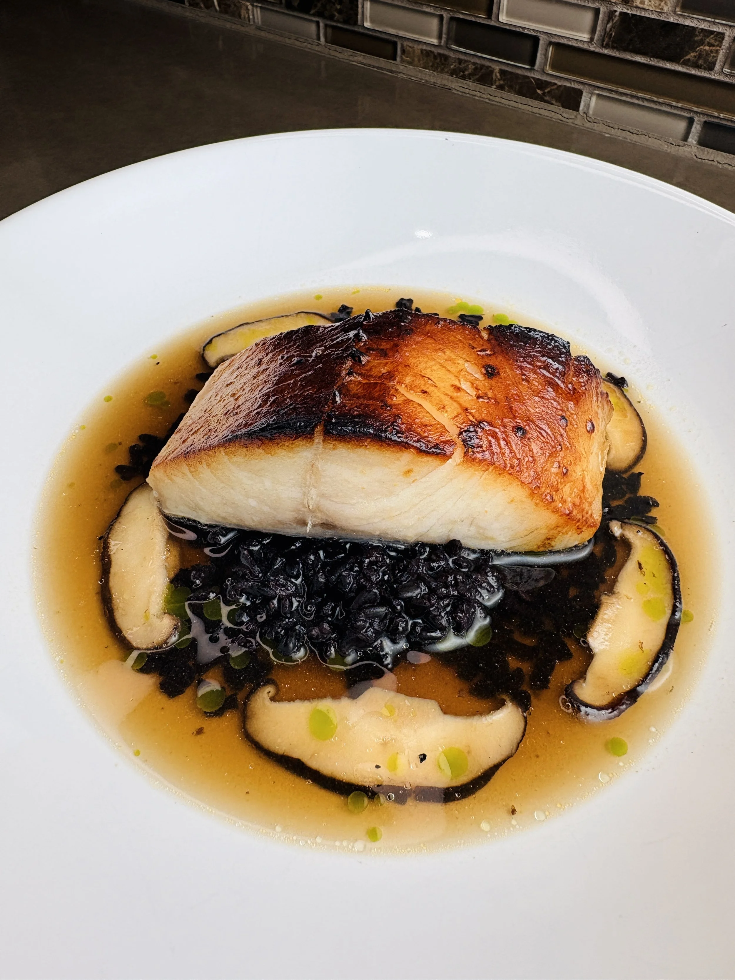 Nobuโs Miso-Glazed Black Cod, Forbidden Rice, Dashi Broth, Shitake