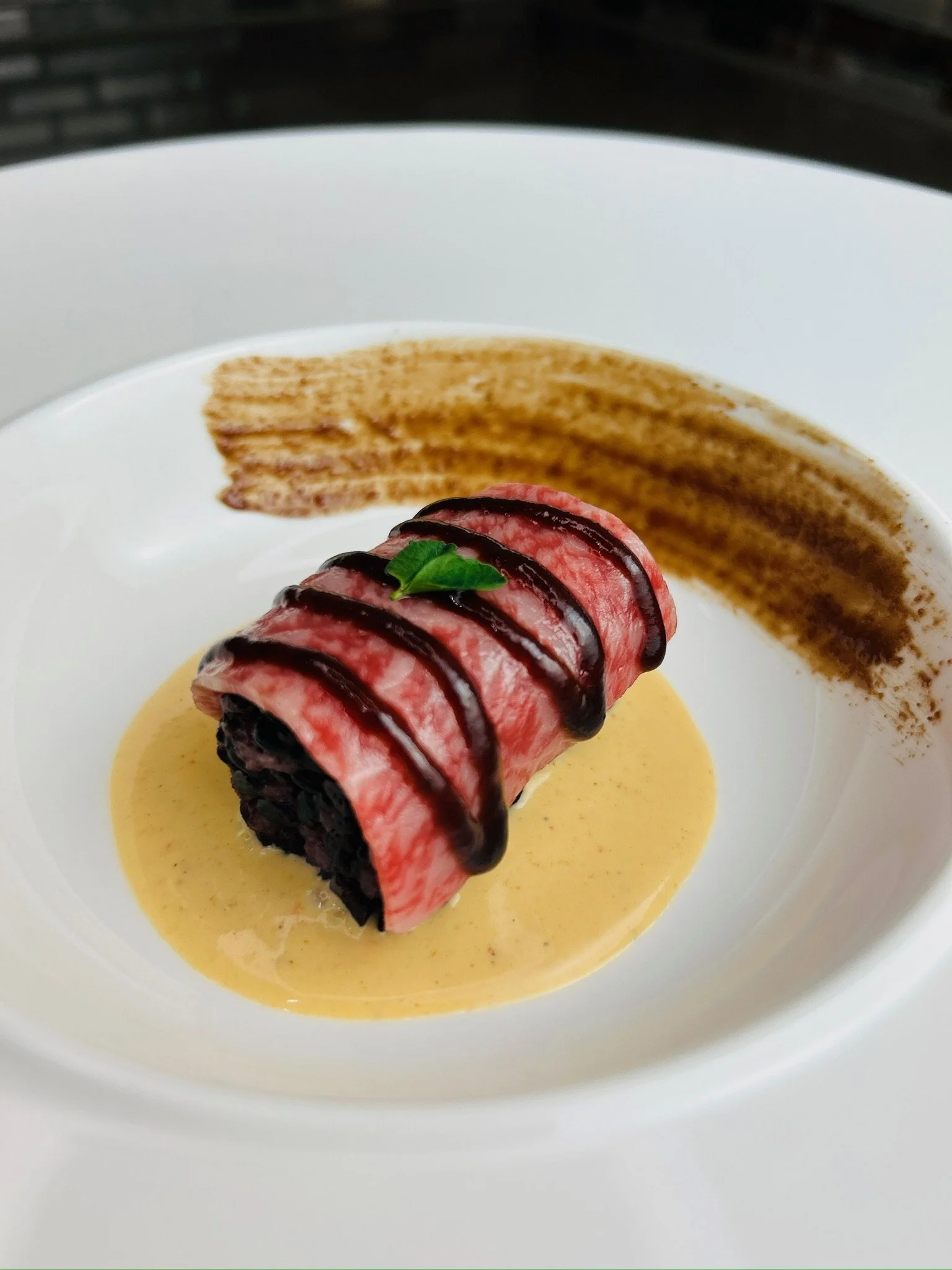 Japanese Wagyu Beef Carpaccio with Black Olive Caramel, Forbidden Rice, Umami Cream